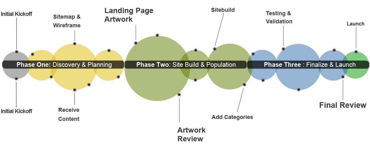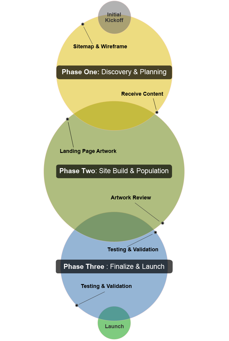 This graphic represents our standard website development process. Project requirements vary and we may modify the process to accommodate custom development needs.
