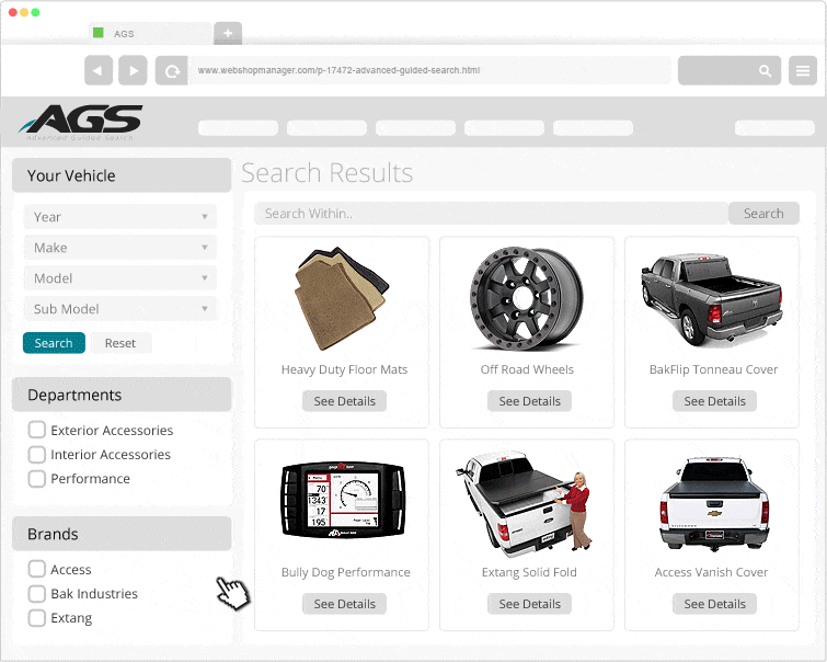 Our platform’s year make model search leverages attributes that are specifically assigned to each product, giving your website an undeniably smooth search experience that will result in: