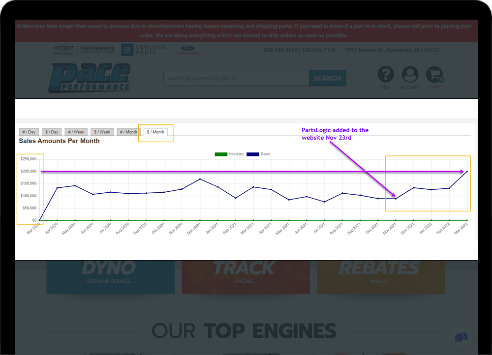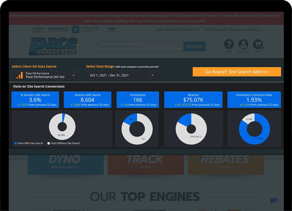 Challenge: Initially, the client did not seek out website improvements. However, they saw a demo of our new PartsLogic site search while at a large industry convention (SEMA) in the fall of 2021. The client was skeptical at first but decided on a three-month trial of PartsLogic site search in hopes of updating their existing on-site search with a more helpful user experience. The client also hoped to grow past a revenue plateau