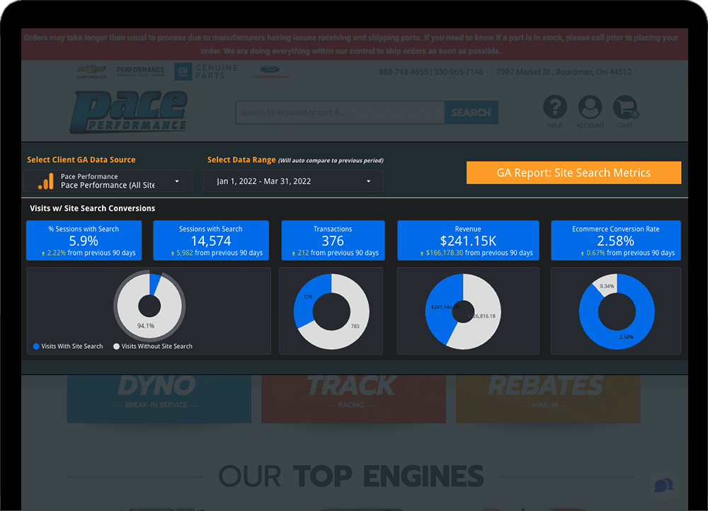 Pace Performance carries parts, accessories and performance components for every General Motors automotive need. The client is primarily a brick-and-mortar dealership with a secondary online retail site that brings in extra business.